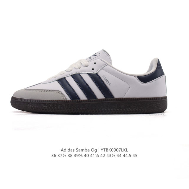 阿迪达斯 德训鞋 Adidas Originals Samba Og Shoes 经典运动鞋小白鞋 T头鞋 男女士板鞋 彰显休闲摩登风情的时尚经典鞋。它诞生于50年代的足球场,随后走向街头和秀场。Adidas Samba自成一格,堪称时尚标杆。这款Samba Og经典鞋,采用柔软皮革鞋面,搭配橡胶外底,舒适休闲。含锯齿三条纹和别致T形鞋头,致敬Samba的传统设计。缀低调烫金细节,更添型格。忠于本源,热爱不老。 常规版型 系带设计 皮革鞋面 织物衬里 橡胶外底。