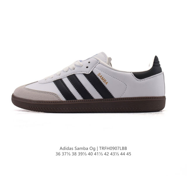 阿迪达斯 德训鞋 Adidas Originals Samba Og Shoes 经典运动鞋小白鞋 T头鞋 男女士板鞋 彰显休闲摩登风情的时尚经典鞋。它诞生于50年代的足球场,随后走向街头和秀场。Adidas Samba自成一格,堪称时尚标杆。这款Samba Og经典鞋,采用柔软皮革鞋面,搭配橡胶外底,舒适休闲。含锯齿三条纹和别致T形鞋头,致敬Samba的传统设计。缀低调烫金细节,更添型格。忠于本源,热爱不老。 常规版型 系带设计 皮革鞋面 织物衬里 橡胶外底。