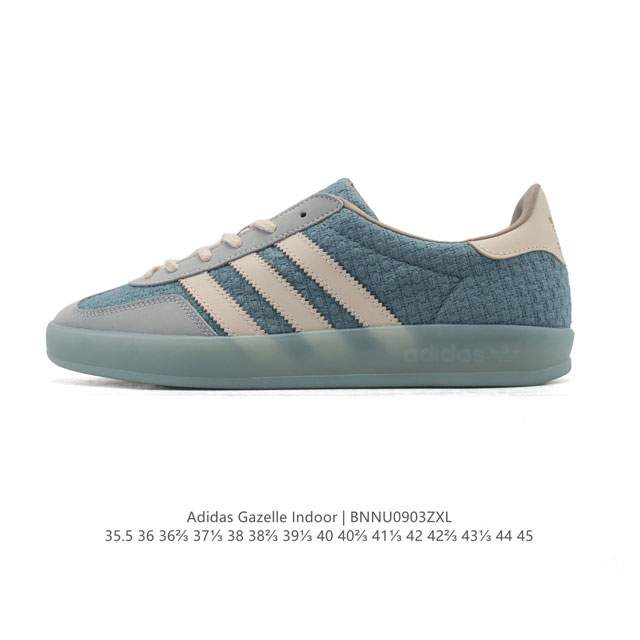 阿迪达斯 Adidas Originals Gazelle Indoor复古三叶草防滑透明橡胶板鞋经典运动鞋。这款经典鞋,忠于原版设计,缀撞色三条纹和鞋跟饰片。采用柔软皮革鞋面,穿着舒适,搭配生胶外底,风格复古。用不同材料制作这款修长复古的从1970年代开始就很受欢迎的网球鞋。Gazelle Indoor拥有包边更宽的T字型鞋头,Gazelle开始将皮革材质引入训练鞋设计之中,从而减轻了运动员双脚的负担。当年这一改动也是为了更好的保护运动员的前掌,以及Gucci X Adidas Gazelle 系列就是