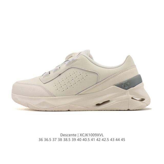 新品公司级 Descente Cron Racer 迪桑特休闲板鞋,男女同款设计,迪桑特Cron Racer系列是一款融合日系极简设计与功能科技的多场景休闲鞋,核心特点如下:1. 核心功能与技术,全天候防滑大底:适配都市通勤、雨天出行等场景。Eva缓震层+Tpu抗扭片:降低骑行、露营等轻运动后的足部疲劳感。易打理材质:牛皮革与麂皮拼接鞋面 好打理皮面 +抗污设计+抗菌鞋垫,适合学生、宝妈等高频使用人群,2. 设计风格与穿搭。日系复古跑鞋风:哑光皮革与翻毛皮材质,突出City Boy风格。薄款夏季设计:无海