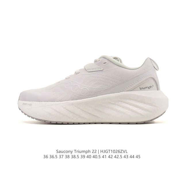Saucony 索康尼 Triumph系列 胜利 22代 中性跑鞋 强缓震跑步鞋轻便男女同款跑鞋夏季透气运动鞋子,是来自美国的专业跑鞋品牌,成立于1898年。Saucony现其产品线分为专业运动系列和复 古休闲系列两大类,为专业跑步运动员及跑步爱好者提供专业、舒适、安全的跑步产品。此款 Triumph 22 跑鞋,定位为旗舰级缓震跑鞋。性能相比前几代再升级:鞋面采用全新升级的工学网设计,贴合脚部更透气。中底部分使用最新的Pwrrun+材质,搭配Pwrrun+鞋垫使中底的大幅加厚,10Mm坡差进一步提供缓震