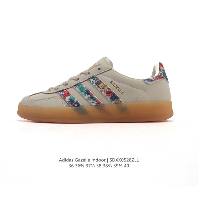 公司级 阿迪达斯 Adidas Originals Gazelle Indoor复古三叶草防滑透明橡胶板鞋经典运动鞋 这款经典鞋,忠于原版设计,缀撞色三条纹和鞋跟饰片 采用柔软皮革鞋面,穿着舒适,搭配生胶外底,风格复古 用不同材料制作这款修长复古的从1970年代开始就很受欢迎的网球鞋 Gazelle Indoor拥有包边更宽的T字型鞋头 Gazelle开始将皮革材质引入训练鞋设计之中 从而减轻了运动员双脚的负担 当年这一改动也是为了更好的保护运动员的前掌 以及Gucci X Adidas Gazelle