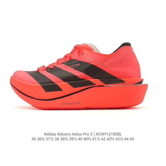 公司级 阿迪达斯 Adizeroadiospro 5 超轻马拉松碳柱专业竞速跑鞋5 运动鞋。Adidas Adizero Adios pro 5 是阿迪达斯旗下专业的马拉松竞速跑鞋,属于Adizero系列的最新产品。根据目前曝光的信息,pro 5 在上一代的基础上进行了显著升级,采用了碳柱+碳板的双重推进系统设计,并且有消息称其使用了环形碳板,在风格和性能上都有较大变化,旨在为跑者提供更强的能量回馈和推进力,助力竞速表现。 DDD 货号: K18295 Ddd 尺码: 36-45含半码 Ddd 编码: X