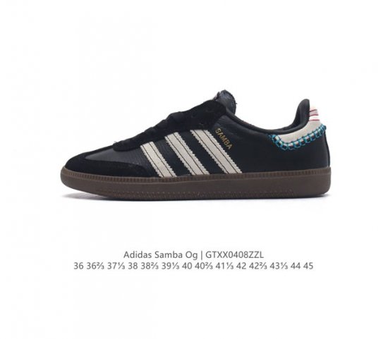 阿迪达斯 德训鞋 Adidas Originals Samba Og Shoes 经典运动鞋小白鞋 T头鞋 男女鞋 彰显休闲摩登风情的时尚经典鞋。它诞生于50年代的足球场,随后走向街头和秀场。Adidas Samba自成一格,堪称时尚标杆。这款samba Og经典鞋,采用皮革鞋面,搭配橡胶外底,舒适休闲。含锯齿三条纹和别致t形鞋头,致敬samba的传统设计。缀低调烫金细节,更添型格。忠于本源,热爱不老。 常规版型 系带设计 皮革鞋面 织物衬里 橡胶外底。