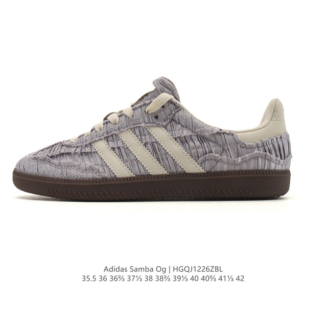 阿迪达斯 德训鞋 Adidas Originals Samba Og Shoes 经典运动鞋小白鞋 T头鞋 男女鞋 彰显休闲摩登风情的时尚经典鞋。它诞生于50年代的足球场,随后走向街头和秀场。Adidas Samba自成一格,堪称时尚标杆。这款Samba Og经典鞋,采用织物鞋面,搭配橡胶外底,舒适休闲。含锯齿三条纹和别致T形鞋头,致敬Samba的传统设计。缀低调烫金细节,更添型格。忠于本源,热爱不老。 常规版型 系带设计 织物鞋面 织物衬里 橡胶外底。 DDD 类型:男女鞋 Ddd 货号:Jq5976