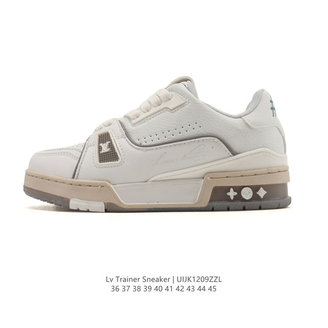 路易威登 Louis Vuitton Lv路易威登板鞋 时尚运动鞋潮厚底增高男女鞋。舒适防滑底和百搭性霸屏整个时尚娱乐圈,细节调整完美主义!采用柔软皮革拼接鞋面,独家开模大底, 侧边采用3D打印标志性Logo 尽显贵族时尚气息,配带正品全套包装。全新Lv路易威登Louis Vuitton Trainer Sneaker Low 休闲运动文化百搭板鞋。 DDD 类型:男女鞋 Ddd 尺码:36-45 Ddd 编码:Uijk1209Zzl DDD