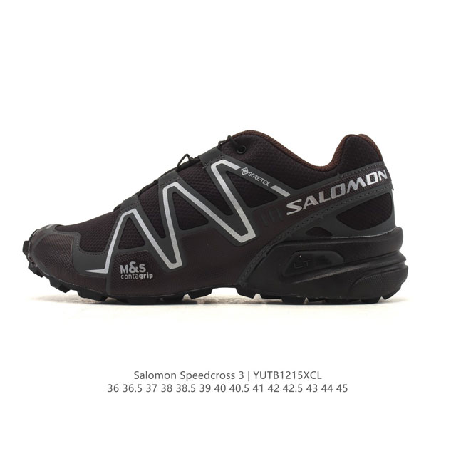 新品公司级 Salomon 萨洛蒙 Speedcross 3 减震 户外 织物 包裹性 支撑 防水 跑鞋 萨洛蒙 Salomon Speedcross 3是一款专为户外越野设计的运动鞋,主要适用于徒步、露营及轻度爬山等场景,兼具功能性与时尚感。防水透气:采用Gtx防水材料,适合雨天或潮湿环境使用,兼顾透气性。 抓地防滑:橡胶大底采用立体齿痕设计,适应铺装路面与非铺装路面,但雨天湿滑路面需注意防滑。 系带系统:抽拉式系带设计,简化户外穿脱流程,减少鞋带散落困扰。 包裹性:鞋帮内采用织物包裹设计,搭配厚实海绵