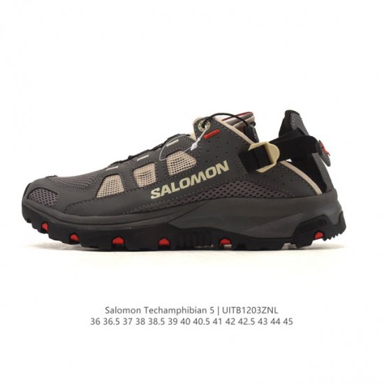 新品公司级 Salomon Techamphibian 5是萨洛蒙推出的水陆两栖运动鞋,专为户外涉水、溯溪等场景设计,兼具速干、抓地和舒适性。速干透气:网眼鞋面搭配速干材料,涉水后15-45分钟可快速干燥,避免闷热感 。 抓地性能:Contagrip Fd橡胶外底采用刀槽花纹设计,湿滑岩石、泥地等复杂地形抓地力强 。 足部保护:鞋头加固设计,搭配Quicklace系带系统,增强脚部支撑与稳定性 。 适用场景:专业溯溪、溪降。户外徒步、露营、钓鱼。城市轻户外活动 如城市探险 DDD 尺码: 36-45含半码