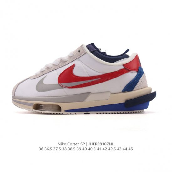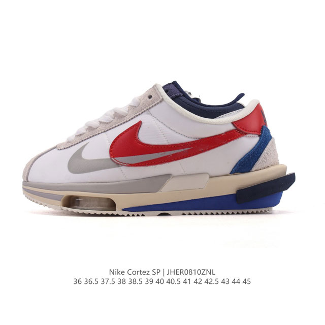 公司级 真标 原楦原纸版开发,厚实牛津布组合翻毛皮革鞋面材质,中底嵌入超轻发泡Eva缓震材质及4层组合鞋底型,前掌嵌入Air Zoom开窗式纤维气垫经典阿甘跑鞋诞生 50 周年纪念款,日式解构美学联名Sacai X Nike Air Zoom Cortez Sp10 Grey White 4.0系列改良阿甘低帮解构厚底老爹风休闲运动慢跑鞋“厚布灰色大红双钩子”。