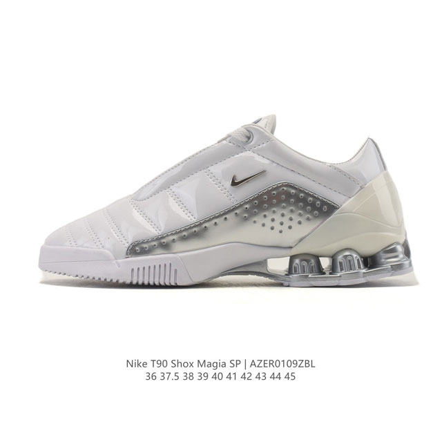 FFF 新品公司级 耐克 Nike Total 90 Shox Secutor Magia 百搭舒适 耐磨 足球鞋 男女同款 银色,Maha Amsterdam X Nike T90 Shox Magia联名系列运动跑步鞋,设计亮点:金属未来主义与复古足球Dna- 双色碰撞:系列包含 Metallic Silver 金属银 与 Black Metallic Silver 黑 银 两款配色,前者以高亮银色鞋面搭配黑色网格纹理,后者采用全黑漆皮与金属银Swoosh形成强烈对比。- 经典元素再现:鞋身延续Tot