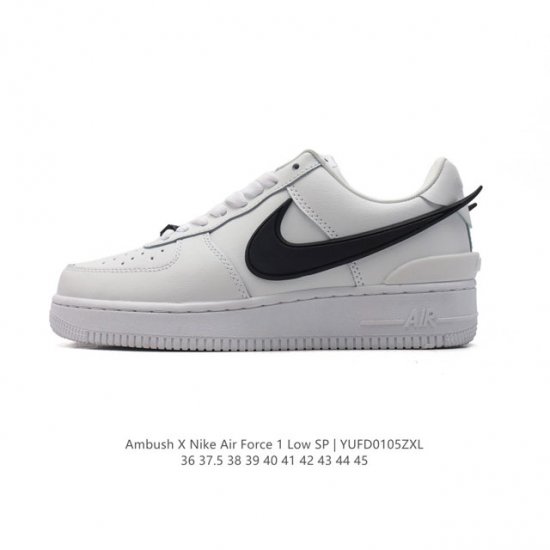 耐克 空军一号 Af1 低帮休闲板鞋 Ambush X Nk Air Force 7 Low Sp 空军一号联名标志性的swoosh延伸至鞋跟之外,鞋舌和鞋垫上印有ambush品牌标志,整体简约大气,可以适配多种造型,鞋身以及内衬均采用了皮革打造,标志性的超大swoosh依旧采用了突出鞋面的造型。鞋带顶端还带有特殊的鞋带扣设计。后跟处搭载了与dunk相同的tpu设计,并且带有ambush字样,彰显联名身份。柔软、弹性十足的缓震性能和出色的中底设计,横跨复古与现代的外型结合,造就出风靡全球三十多年的forc