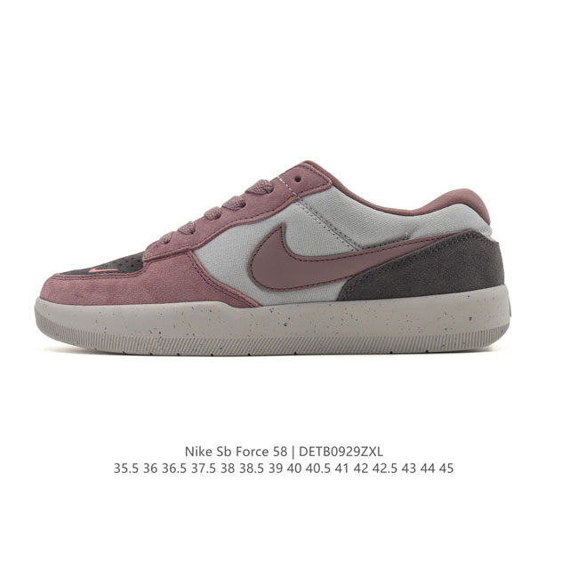 / 耐克Nike Sb Force 58 运动滑板鞋。这是一款将前沿创新带入街头的单品,它具有硫化杯底,具有出色的耐用性和灵活性。使用柔软皮革拼接,在饰面上放置通风