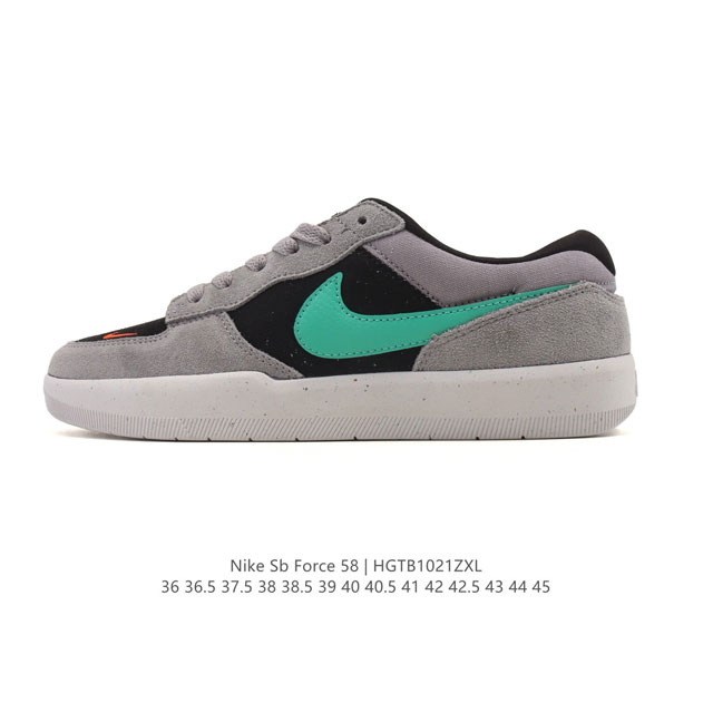 / 耐克Nike Sb Force 58 运动滑板鞋。这是一款将前沿创新带入街头的单品,它具有硫化杯底,具有出色的耐用性和灵活性。使用柔软皮革拼接,在饰面上放置通风